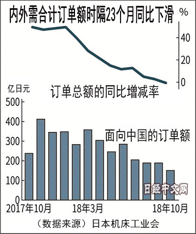 《日經中文網》援引日本機牀工業會22日發佈的數據顯示,10月份對華出口訂單同比減少了36.5%,已連續8個月下滑。日本的內需和對歐美出口訂單的增長也未能彌補,整體訂單額同比減少0.7%。
