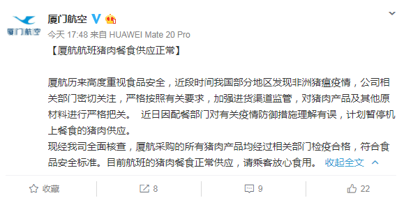 據@廈門航空 11月24日消息,廈航歷來高度重視食品安全,近段時間我國部分地區發現非洲豬瘟疫情,公司相關部門密切關注,嚴格按照有關要求,加強進貨渠道監管,對豬肉產品及其他原材料進行嚴格把關。 近日因配餐部門對有關疫情防禦措施理解有誤,計劃暫停機上餐食的豬肉供應。