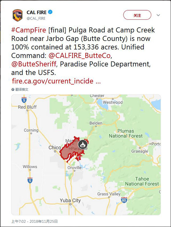據美國有線電視新聞網(CNN)報道,加利福尼亞州森林及防火局(CAL FIRE)當地時間11月25日宣佈,肆虐加州北部比尤特郡(Butte County)已半月有餘的山火已經完全得以控制。這比之前預計的30日提前了5天。