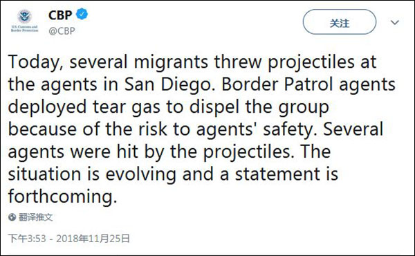 CBP表示動用催淚彈是出於安全考慮 圖自CBP推特