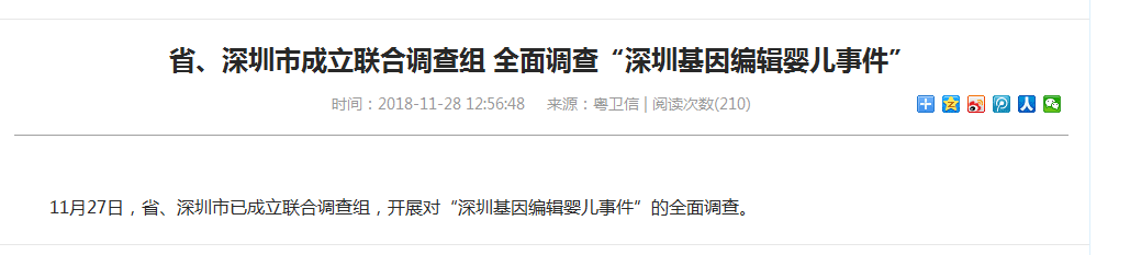 據廣東省衞生健康委員會官網11月28日消息,11月27日,廣東省、深圳市已成立聯合調查組,開展對“深圳基因編輯嬰兒事件”的全面調查。