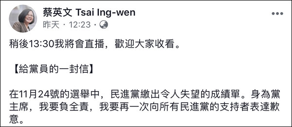 昨天(28日),蔡英文在社交網站發表長文,並直播下午選後首次中常會的發言內容,針對此次大敗反省道歉。