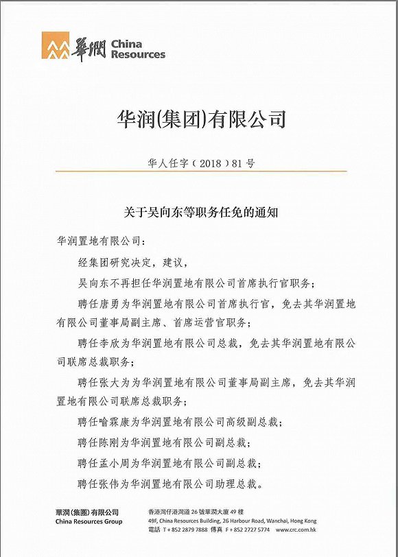 界面新聞獲得的一份華潤(集團)有限公司人事任免通知顯示,吳向東不再擔任華潤置地有限公司首席執行官職務,聘任唐勇為華潤置地首席執行官,免去其華潤置地董事局副主席、首席運營官職務。與此同時,聘任李欣為華潤置地總裁,免去其華潤置地聯席總裁職務;聘任張大為為華潤置地董事局副主席,免去其華潤置地聯席總裁職務。