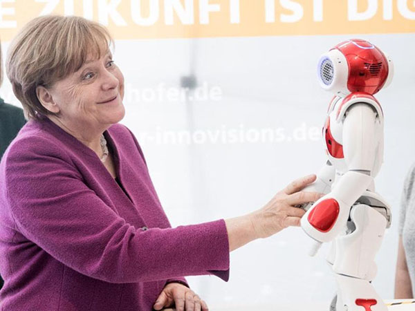 4月默克爾在出席活動時與機器人NAO搞怪互動 圖自 德國斯圖加特消息