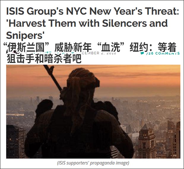 連日來,一家支持極端組織“伊斯蘭國”(IS)的媒體放出威脅,將在新年“血洗”紐約,狙擊手和郵件炸彈已在路上。