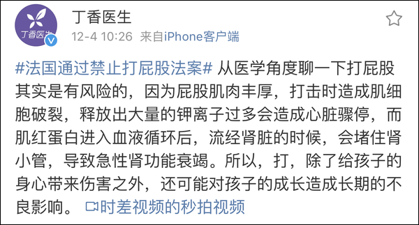微博認證為“丁香園旗下健康科普平台”的@丁香醫生 表示,打屁股其實是有風險的,因為屁股肌肉豐厚,打擊時造成肌細胞破裂,釋放出大量的鉀離子過多會造成心臟驟停。