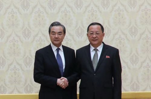 當地時間2018年5月2日,國務委員兼外交部長王毅在平壤同朝鮮勞動黨中央政治局委員、外務相李勇浩舉行會談。圖片來自外交部網站