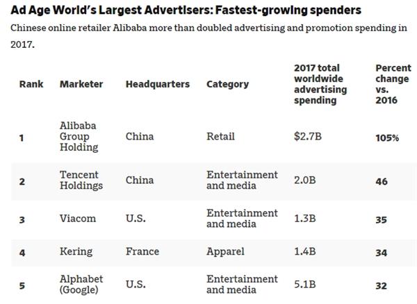 12月3日,AdAge分享了一組有趣的排名,以全球企業2017年的廣告總支出為量綱。