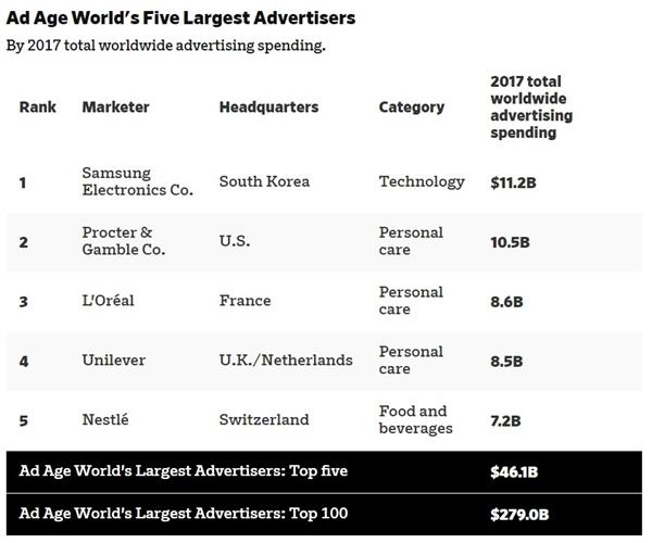 總榜顯示,三星電子以112億美元的廣告支出高居榜首,2~5名分別是寶潔(P&G)、巴黎歐萊雅、聯合利華和雀巢。