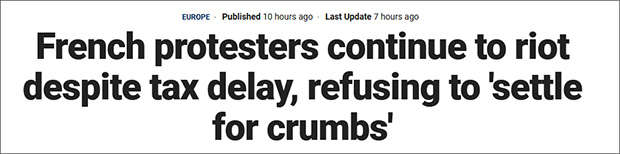 福克斯新聞12月5日報道標題:不顧暫停上調燃油税聲明,法國抗議者拒絕“為麪包屑妥協”,將繼續抗議活動
