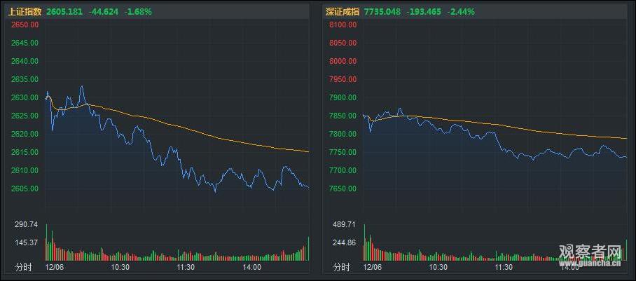 12月6日,滬深兩市雙雙跳空低開,隨後一路震盪走低。行業板塊全線盡墨,通訊行業板塊領跌,其中,中興通訊全天大跌逾5%。截至收盤,滬指報2605.18點,跌1.68%;深成指報7735.05點,跌2.44%; 創業板收報1345.76點,跌2.61%。兩市合計成交超過3000億元。