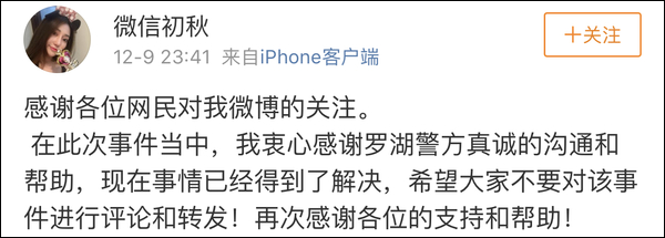 在羅湖公安發佈警情通告後,程某也發佈了事情已經得到解決的博文,此前爆料微博均已刪除。