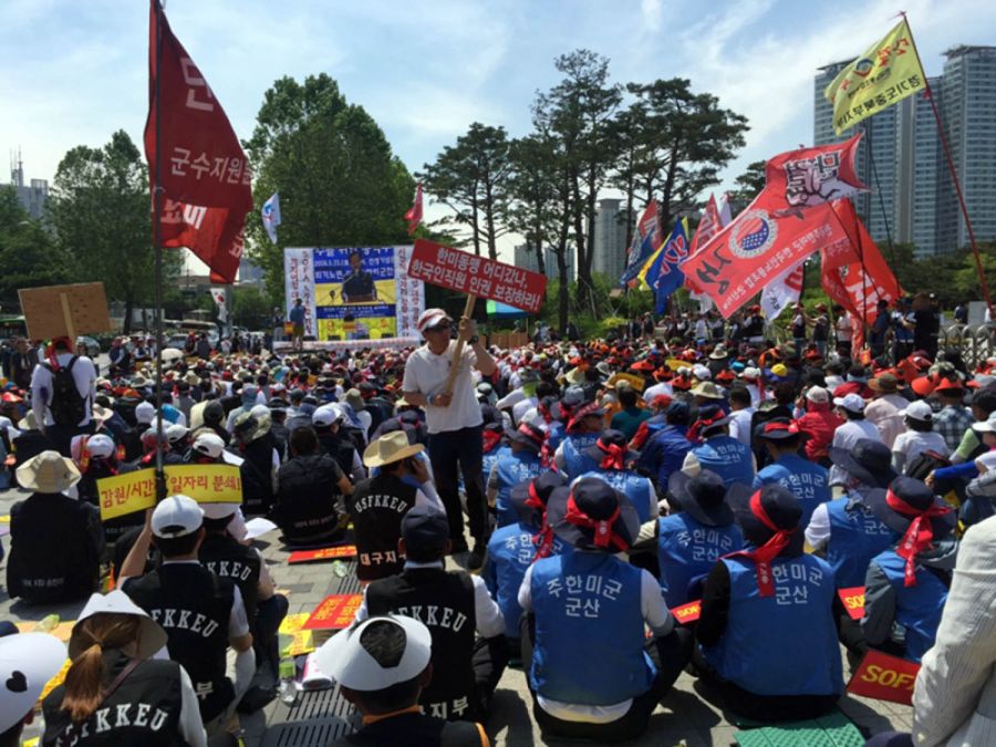美軍今年4月宣佈削減駐首爾龍山區的駐軍及245個韓國工人崗位,引發當地抗議 圖源:《星條旗報》