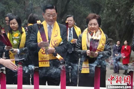 資料圖:2013年祭拜黃帝陵時,江丙坤與夫人上香。圖片來自中新網