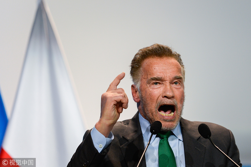 好萊塢明星和前加州州長施瓦辛格在會上發表激情演説 來源:視覺中國