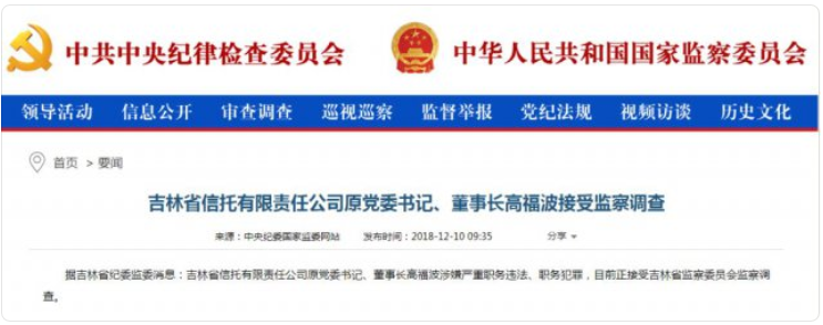 説回高福波,他於2015年10月已經辭職離開吉林信託,也就是説,辭職3年後,被宣佈接受調查。