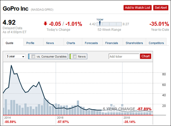 作為曾經的明星企業,GoPro在2014年上市後一度風光無限,但其股價在2014年創下近100美元的峯值後,一路下滑至如今的不到5美元。