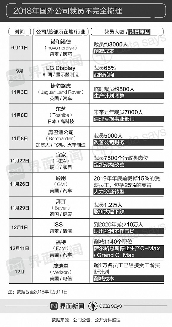 據界面數據不完全統計,2018年先後至少有11家國外公司被曝出裁員,其中包括捷豹路虎、通用和福特3家車企。