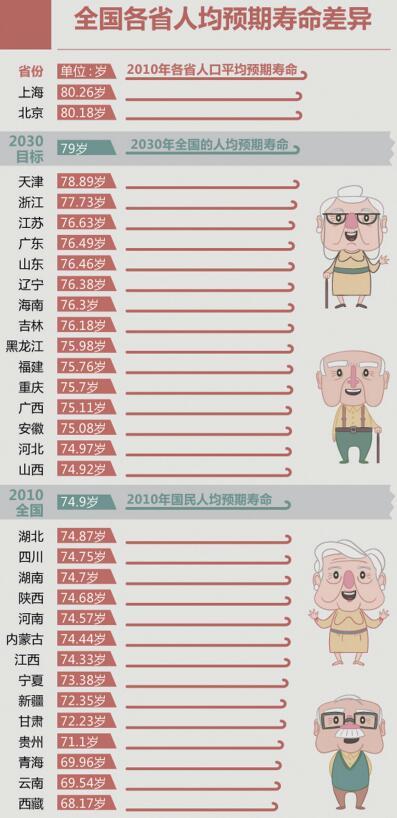西藏“十三五”衞生計生規劃預計,在2015年68.2歲的基礎上全區“十三五”末即2020年的人均預期壽命將達到70歲,這比五十年代的35.5歲提高了近1倍。預計到2030年,西藏居民的主要健康指標接近中西部地區平均水平,人均期望壽命達到73歲。