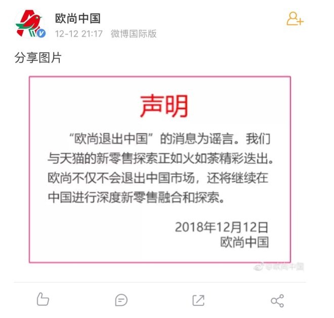 針對媒體報道,12日晚間,歐尚在其官方微博發表聲明,稱“‘歐尚退出中國’的消息為謠言”。該則聲明另稱:“我們與天貓的新零售探索正如火如荼,精彩迭出。歐尚不僅不會退出中國市場,還將繼續在中國進行深度新零售融合和探索。”