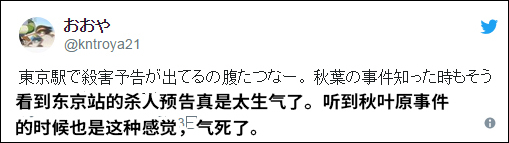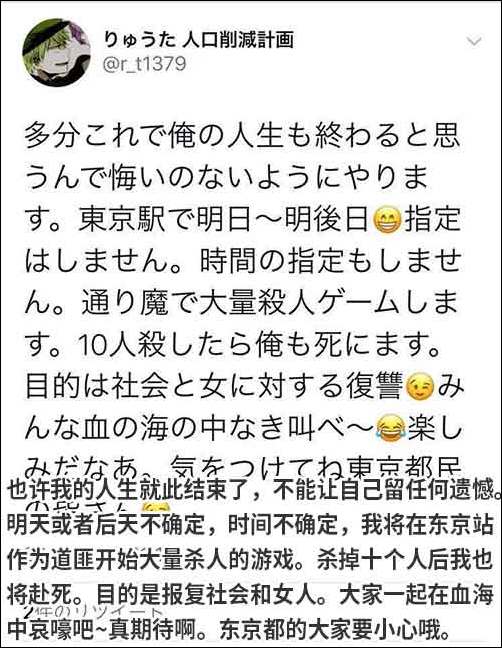 發佈該消息的用户名為“龍太 人口削減計劃 最後的任務”(Twitter:@r_t1379),這篇推文發佈後瞬間被大量轉發擴散,很多推特用户向警察通報。目前,東京站附近大量的警察正處於警戒狀態。