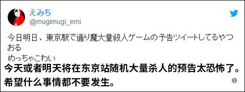 據瞭解,推特用户“龍太 人口削減計劃 最後的任務”曾經也發佈過“在橫濱市的某一個車站隨機殺人”的預告。由於這一項預告並沒有被實行,此次東京站大量殺人預告可能也只是惡作劇。