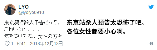 據日本讀賣新聞12月13日報道,12日下午9點20分左右,日本警方接到報警稱“推特上有人發佈將在東京站隨機殺人的預告”,預告稱“將會殺掉十個人”。東京警視廳從12日晚開始在JR東京站周邊加強警戒,並開始調查消息的發信源。