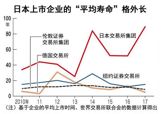 按照這種算法,2017年美國紐約證券交易所上市企業的平均壽命為15年,英國倫敦證券交易所為9年。而在日本交易所上市的企業的平均壽命為89年,極其長壽。