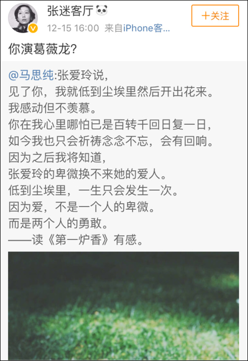 15日,她在微博分享了張愛玲《第一爐香》的讀後感,這次卻引發了爭議。