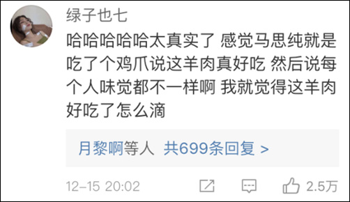 有網友嘲諷馬思純什麼書都能讀成青春傷痛文學,馬思純出現在評論裏,表示“如果我六十歲還覺得一切都是青春小説,我想我會是個幸福的人”。