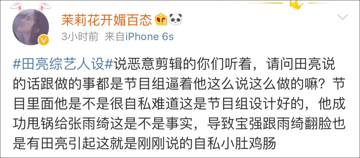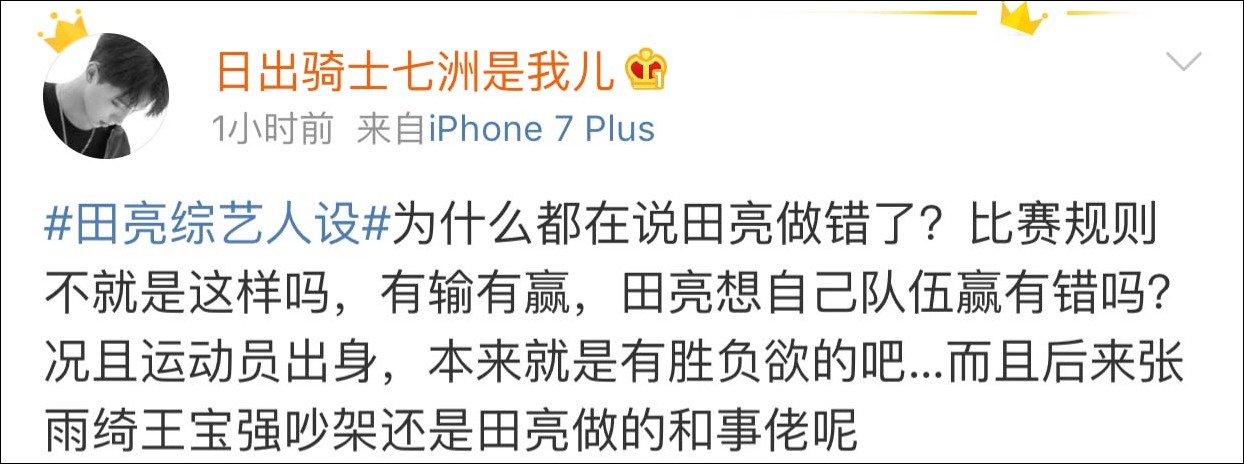 16日,田亮在社交媒體回應近日網絡上關於“田亮人設”的一系列爭議,他表示:我們不僅有導演,還有後期,對因為節目人設影響到心情的朋友説一聲對不住了!
