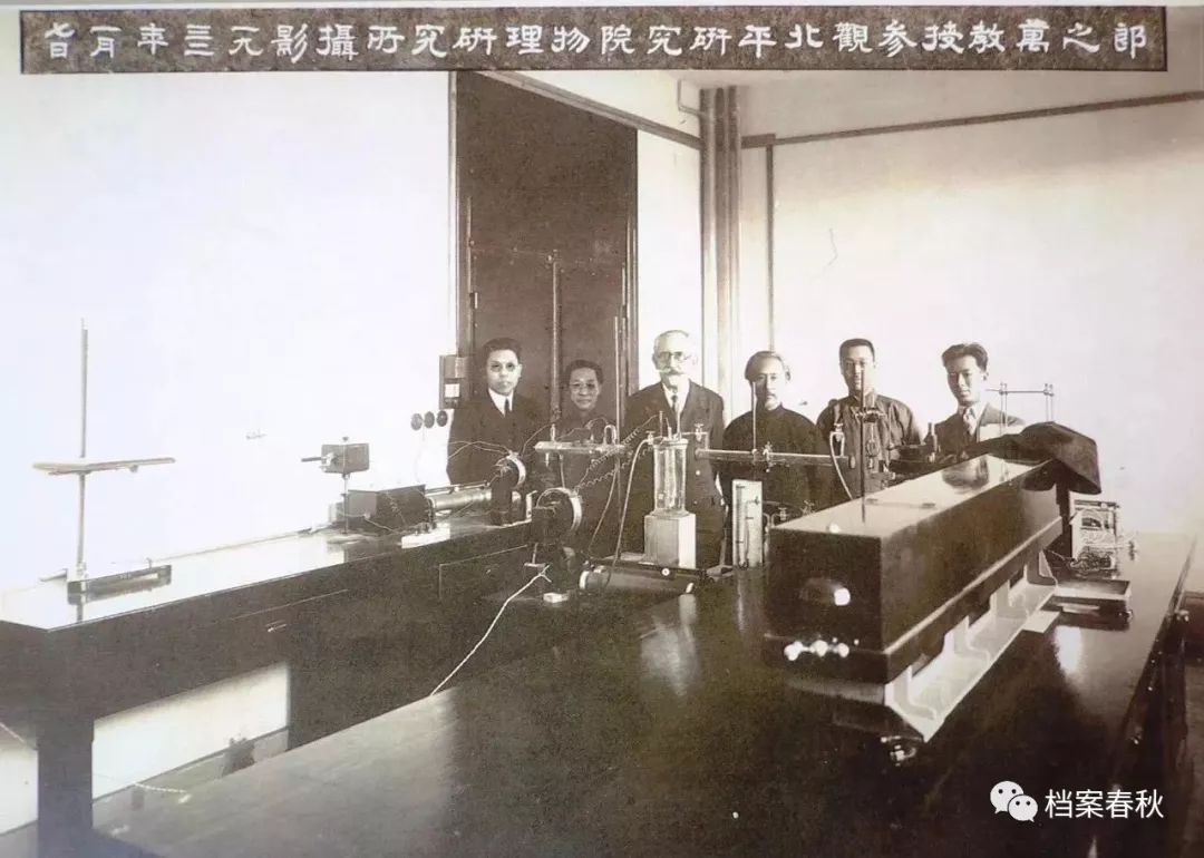 法國物理學家郎之萬參觀北平研究院物理學研究所(左起嚴濟慈、翁文灝、郎之萬等)