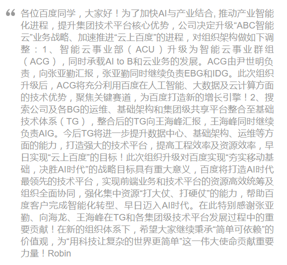 百度創始人、董事長李彥宏在內部信中稱,此次調整是為了加快AI與產業結合,推動產業智能化。利用百度在AI、大數據及雲計算上的技術優勢,聚焦關鍵賽道,為百度打造新的增長引擎。