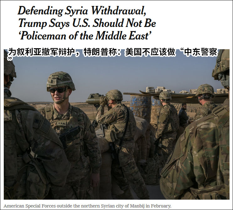 本週四,面對兩黨的批評和外界的輿論壓力,特朗普推特連發數條信息,為之前發佈的的撤軍消息辯護。他堅稱,美國不想成為**“中東警察****”**,“美軍撤出敍利亞並不意外,打擊極端組織“伊斯蘭國”(IS)的任務已完成”。
