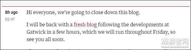 休息2小時,大約凌晨5點左右,《衞報》又繼續了:“早上好,歡迎來到蓋特威克混亂現場博客。對於那些在蓋特威克機場度過了一個自我感覺相當不舒服夜晚的人,表示歡迎。我們首先來看一些好消息,蓋特威克機場宣佈可能很快會部分重新開放。”
