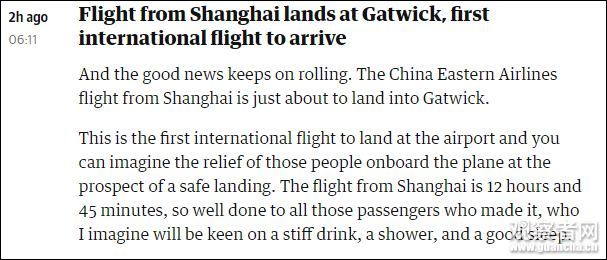 但東方航空的MU201緊隨其後,**在6點多成為第一架降落的國際航班。**顯然,這更讓人興奮。《衞報》這樣寫道:“這是第一架降落在機場的國際航班,你可以想象飛機上的人看到安全着陸時的欣慰。從上海起飛的航班需要飛行12小時45分鐘,對於所有成功抵達的乘客來説,他們都做得非常好,我想他們會想要喝一杯烈酒,洗個澡,睡個好覺。”
