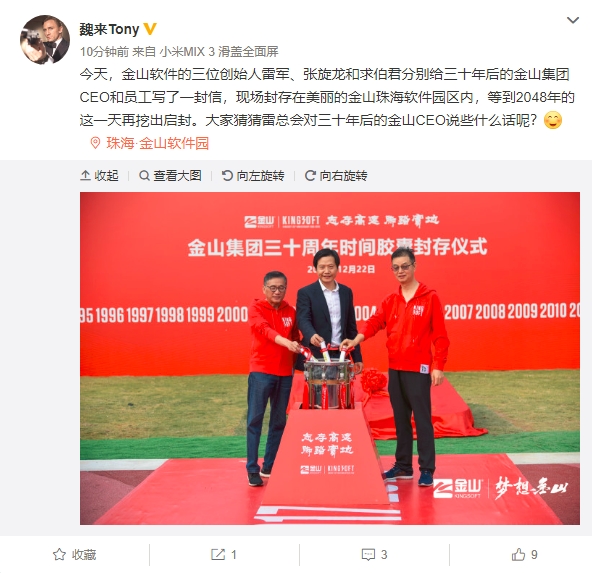另據小米董事長特別助理@魏來Tony 透露:“金山軟件的三位創始人雷軍、張旋龍和求伯君分別給三十年後的金山集團CEO和員工寫了一封信,現場封存在美麗的金山珠海軟件園區內,等到2048年的這一天再挖出啓封。大家猜猜雷總會對三十年後的金山CEO説些什麼話呢?”