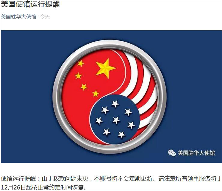 美國駐華大使館12月23日通過官方微信公眾號“美國駐華大使館”和官方微博@美國駐華大使館 發佈運行提醒 ,稱由於撥款問題未決,本賬號將不會定期更新。請注意所有領事服務將於12月26日起按正常約定時間恢復。