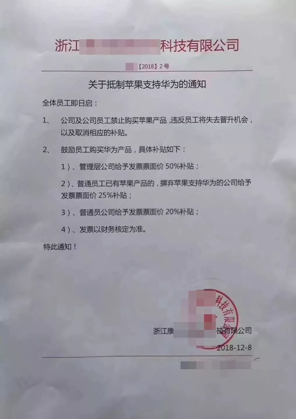通知中寫明:公司及公司員工禁止購買蘋果產品,違反員工將失去晉升機會,以及取消相應的補貼。