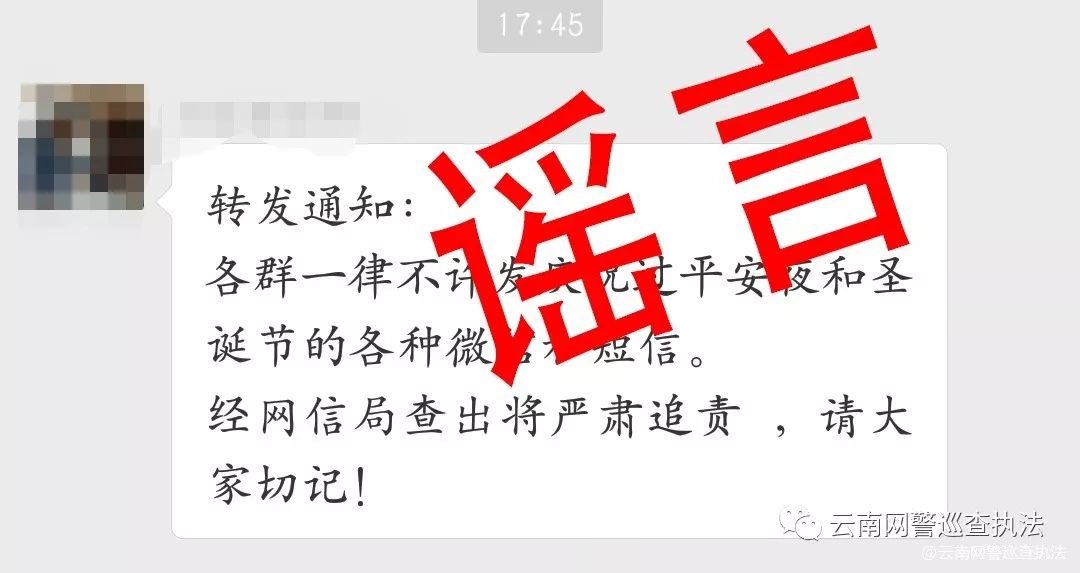 據微信公眾號“雲南網警巡查執法”(ID:yunnanwangjing110)12月24日消息,12月24日、25日是西方國家宗教節日平安夜、聖誕節。有網民向“雲南網警”反映稱,在微信羣裏收到了這樣一條消息,向蜀黍求證真假。消息是這樣的:“轉發通知:各羣一律不許發慶祝過平安夜和聖誕節的各種微信和短信。經網信局查出將嚴肅追責,請大家切記!”