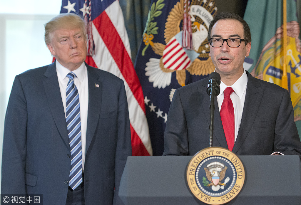 2017年4月21日,特朗普就任後首次現身美國財政部,右為姆努欽。圖自視覺中國