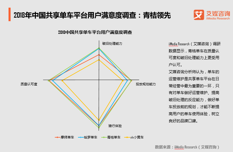 12月25日,新經濟產業第三方數據挖掘和分析機構艾媒諮詢(iiMedia Research)發佈《2018中國共享單車發展現狀專題研究報告》(下稱《研究報告》)。在對用户就質量認可度、破舊處理能力、騎行體驗和投放規劃能力四個維度進行調研後發現,青桔單車的用户滿意度最高。