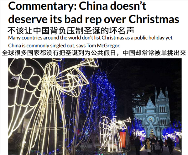 12月25日,新加坡亞洲新聞台(Channel NewsAsia)刊登了其亞太事務評論員湯姆·麥格雷戈(Tom McGregor)的文章,題為“不該讓中國揹負壓制聖誕的壞名聲”。