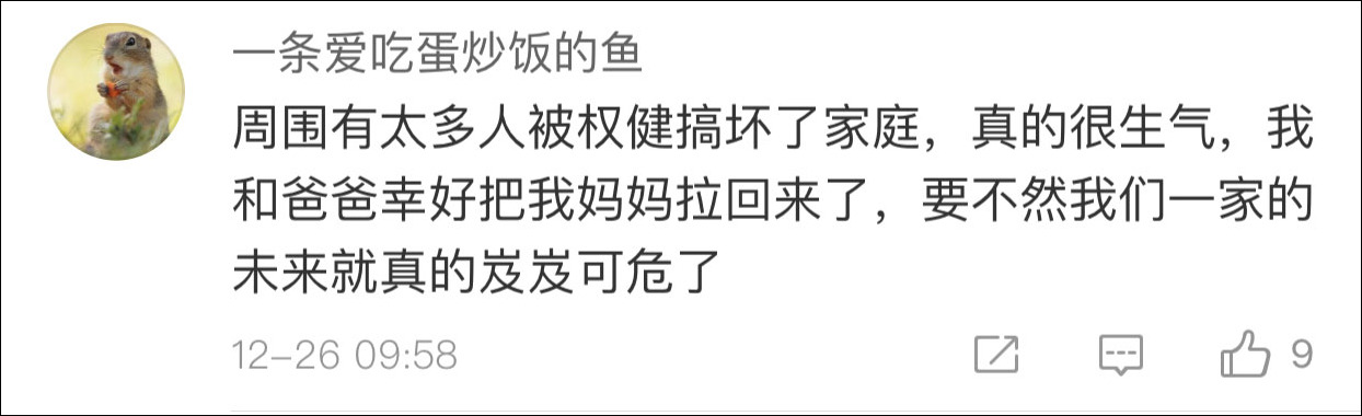 當事人常自述是工薪家庭,有家人被洗腦,投入數萬資金,瘋狂發展下線,家庭分崩離析。在權健發展的大時代,這些是微弱的刺耳聲音。