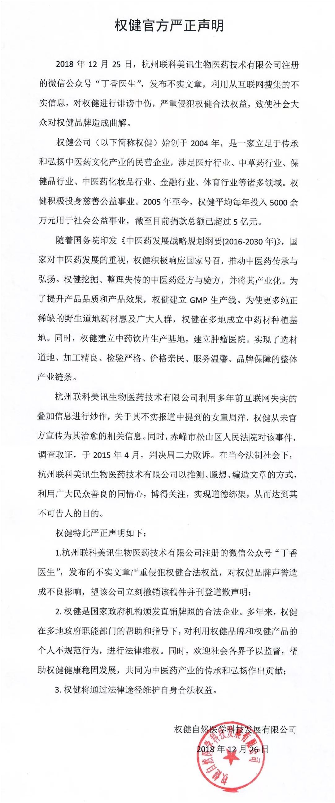 今日(26日)凌晨,權健自然醫學在其官微發佈聲明稱:網傳文章內容是對權健進行誹謗重傷,嚴重侵犯權健合法權益,致使社會大眾對權健品牌造成曲解。在這份聲明中,權健主要説明了以下幾點: