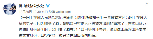 廣州一男子酒後忘記自己被通緝,進派出所辦身份證明時被警方抓獲。
