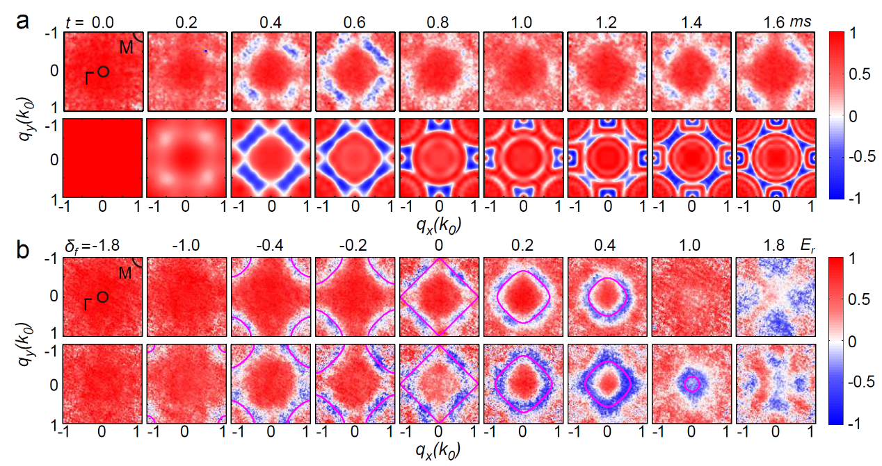 (2018)]。在此基礎上,研究小組利用非平衡態動力學方法在實驗上首次直接精確測量了能帶拓撲。他們利用量子淬火機制,使體系處於非平衡態,並在二維自旋軌道耦合哈密頓量下進行幺正動力學演化。在演化過程中,他們觀察到自旋極化在二維準動量空間上產生了圈狀結構,此結構被證實是近期理論提出的拓撲能帶反轉面的直接證據[Science