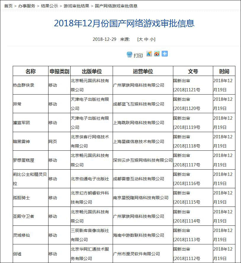 國家新聞出版廣電總局網站12月29日公佈2018年12月份國產網絡遊戲審批信息,共計80款遊戲在列。其中67款手遊、6款端遊、6款頁遊、1款PS4遊戲。其中包括巨人旗下一款遊戲,四三九九有兩款遊戲,三七互娛、中青寶均有代理的遊戲在列,騰訊和網易旗下的遊戲暫未在列。