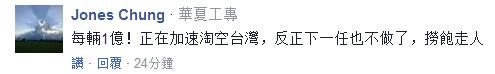 也有網友痛批:“每輛1億!正在加速掏空台灣,反正(蔡英文)下一任也不做了,撈完錢走人。”