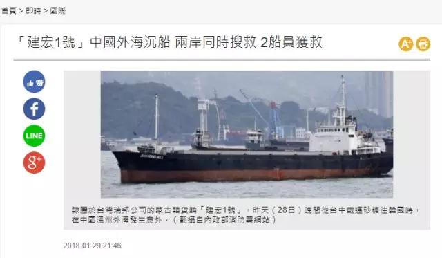 一艘隸屬於台灣瑞邦船運公司、從台中載運白砂糖到韓國的蒙古籍貨輪“建宏1號”(JIAN HONG NO.1)28日晚在温州外海發生意外。正在海上執行任務的中國海軍濟南艦成功救起2名落水人員。與此同時,台灣方面也派出軍機進行搜救,台媒稱,這是兩岸罕見在同一事件中同時執行搜救任務。